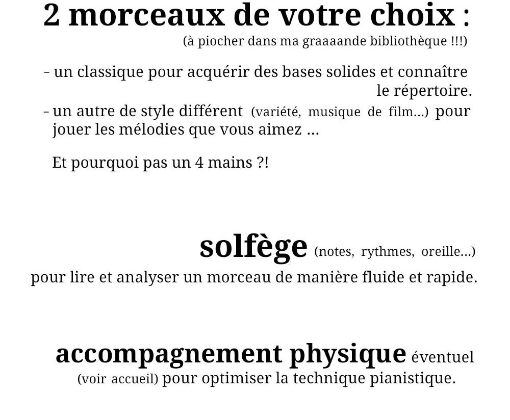 divider Accueil Pour qui ? Durée d'un cours de piano Pédagogie Type d'instrument Lieu & horaires Tarifs Séance d'essai divider